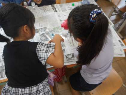 どちらがおおくはいるかな?算数科の学習で,かさくらべをしました。空き容器を使って,入る水のかさをくらべました。活動する中で,同じコップや同じ大きさの容器で比べることが大事!とふりかえりで発表することができました。