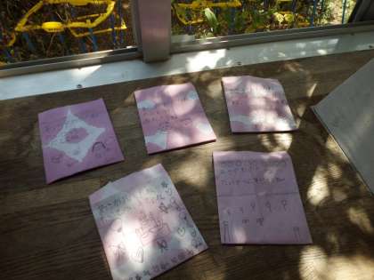 今日は,あさがおの色水で作った和紙を使って,封筒を作りました。