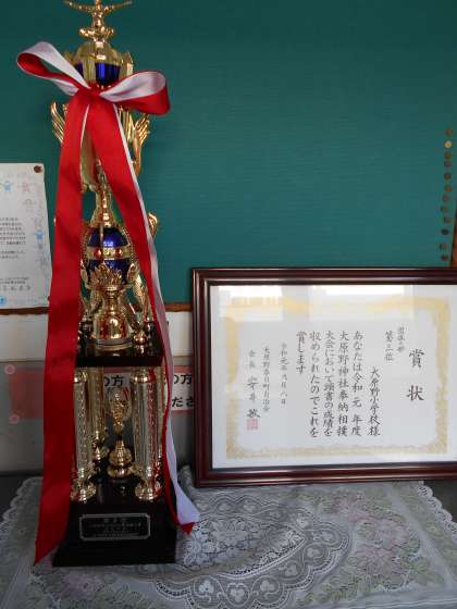 団体戦でいただいたトロフィーや賞状などは学校玄関・大原やに置いてあります。