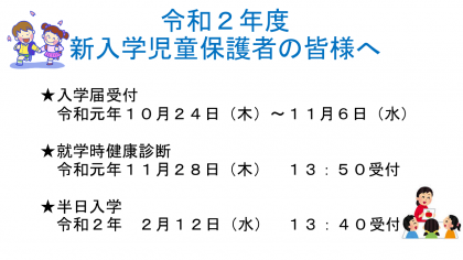 上記の日程で,入学届の受付,就学時健康診断および半日入学を行います。詳細につきましては,後日お知らせします。