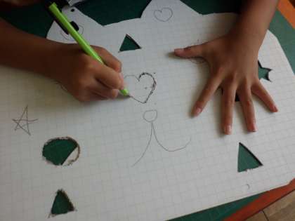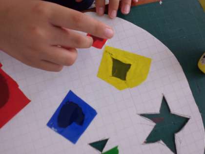 図画工作科で「光のプレゼント」を作っています。カッターナイフで,安全に気を付けて切っています。上手に切れると「切れた!」「ハートができた。」と喜んでいます。どの子も真剣に一生懸命です。切れるとセロファンをはります。はったセロファンを見ると「きれい。」と嬉しそうです。
