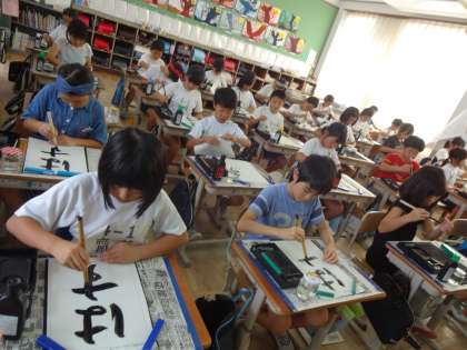 書写の学習,結びの筆使いに気をつけて,「はす」と書きました。結びの筆遣いを知り,何度も練習しました。気持ちの良い緊張感が流れる中,「おー!うまく書けた!」と満足する声がたくさん聞こえ,私も嬉しくなりました。4年生6年生の学習室前に掲示していますので,ぜひ見に来てください!