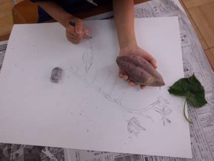 さつまいもを実際に持ったり触ったりして,形や触った感じはどんなのかを確かめました。前に描いた,つるとつなげてさつまいもを描きました。いろいろなさつまいもの形ができました。