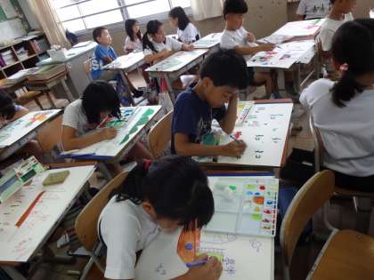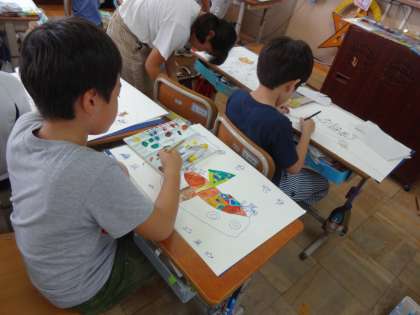 「ヤマネコとウミネコ」というお話をもとに,自分たちが書きたい場面を選び,表現しています。今日は,線からはみ出ないように,自分がイメージする色を1つ1つ,とってもていねいに色づけしました。「すごく上手に色をつけられた!」と笑顔が。どんな作品になるのか…,楽しみです!!