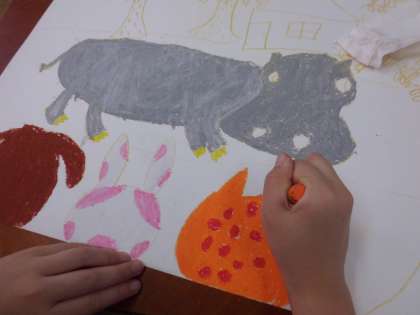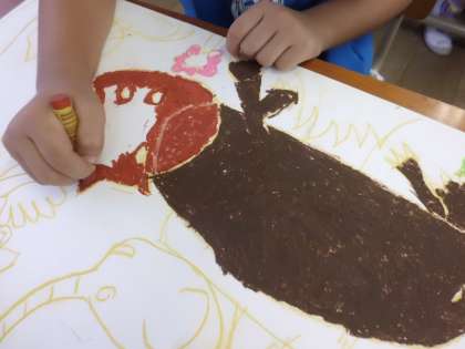 お話の絵をていねいに描いてがんばっています。自分の想像した絵に合う色を楽しくぬっています。どのような絵が仕上がるか楽しみです。
