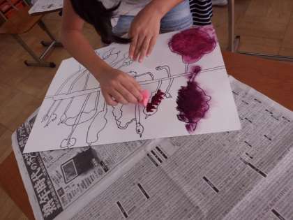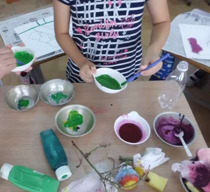 みんなでさつまいもやつるの色をよく観察しました。紫や緑などいろんな色を混ぜてタンポで色をつけることができました。絵の具バイキングコーナーで,自分たちで色を選び,量も考えて色作りをしていました。