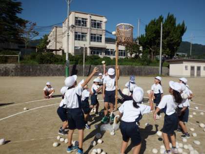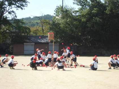 運動会に向けて,玉入れの練習をしました。1年生は6年生と一緒に競技をします。「もっと高く!」「かごをよく見て〜!」6年生からのステキなアドバスのおかげで,少しずつ玉が入るようになりました。本番はいくつ入るかな?ワクワクどきどきがいっぱいの運動会が待ち遠しいですね。