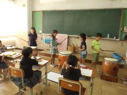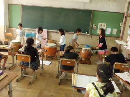 音楽科の「おまつりの音楽」学習で,自分達で考えたリズムを太鼓で表現しました。どの子も,リズムに気を付けてたたくことができました。