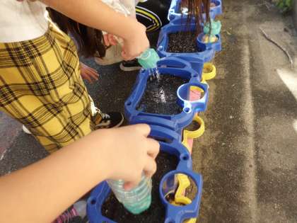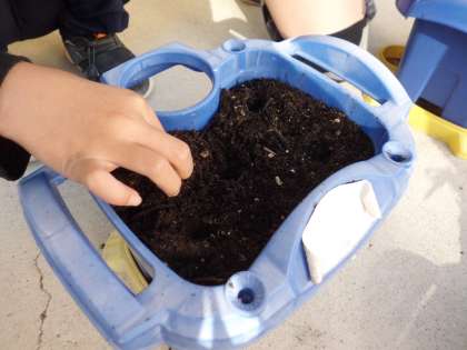 ハツカダイコンの種をまきました。種が小さいのに驚いていて,穴にそっと種を入れて土をかぶせていました。「早く大きくなあれ。」と声をかけながら水をまきました。