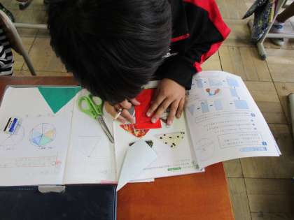 3年生は三角形の学習をしています。折り紙を使って二等辺三角形や正三角形を作りました。辺の長さや角の大きさについて知ることができました。