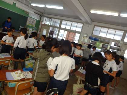 アルファベットを英語で話せるようになった子ども達。自分がカードと同じアルファベットを持っている友達をさがして,「ロック シザー ペイパー」と英語でじゃんけん。アルファベット仲間を探してどんどん英語を使っていました!