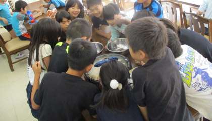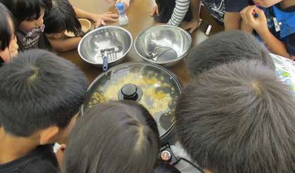 じっくり種がはじけるのを観察する子どもたち。ポン!とはじける様子に大興奮でした。
