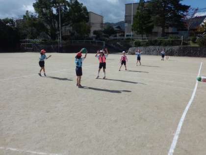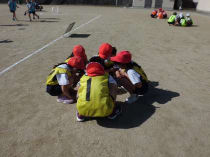 体育科のパスゲームで,チームごとに作戦を練ったり,声をかけあったりとチームワークを大切にしています。ゲームでの動きも良くなってきています。