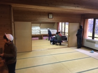 4日間,お世話になった山の家を,みんなで掃除しています。感謝の気持ちを込めて,「来た時よりも美しく」して帰ります。