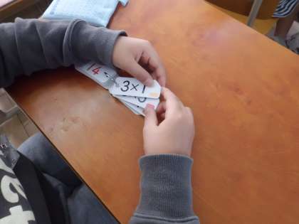 九九カードを使って,九九の練習をしています。正確に速く唱えられるようにがんばっています。九九をきちんと覚えられるようにしていきたいです。