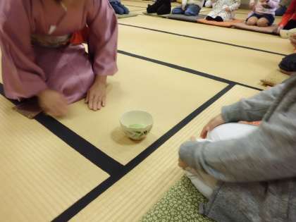 25日(月)の3時間目に,「ふだん着の茶道教室」の皆さんにお世話になり,茶道の体験学習をしました。初めて,茶道にふれる子どもたちも多かったですが,丁寧に教えてくださったおかげで,手の合わせ方やお抹茶のいただき方も上手に出来ていた子どもたち。ちょっぴり苦いお抹茶もみんなでいただくと,美味しく感じたようで,「また体験してみたい。」「お抹茶もお菓子もとてもおいしかった。」と感想を伝えることもできました。