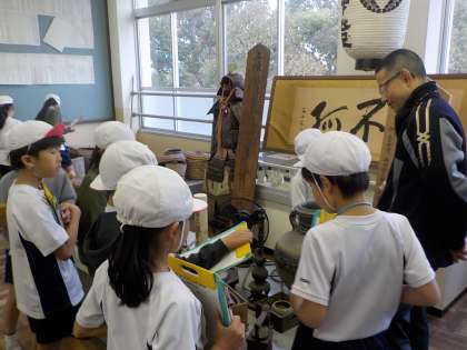 社会科「昔を伝えるもの」の学習で,郷土資料室へ行って,昔の道具を調べました。校長先生にもいろいろ教えていただきました。