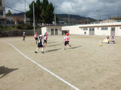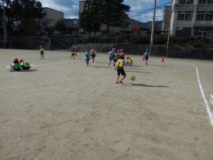 体育科で「ボールけりゲーム」を学習しています。どのチームも,ゴールに向かってどんどんけったりパスしたりシュートしたりして,楽しく行っています。