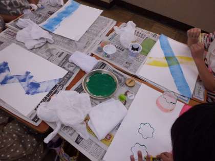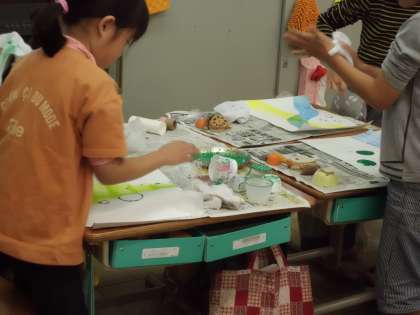 図画工作科の「うつしたかたちから」の学習で,野菜のきれはしやカップなどのかたちをスタンプのようにしておしました。「れんこんは穴があいていて面白いね。」「せんたくばさみは,花のくきのように見えるね。」「あっ!魚の形にも見える〜!」など話しながら,楽しく活動することができました。子どもたちの感性は豊かで,無限大です。ステキな作品が出来上がること間違いなし!!
