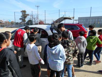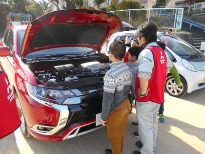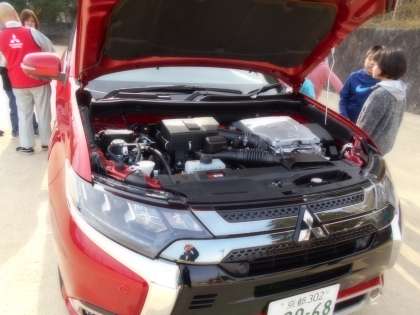 電気自動車とプラグインハイブリッドカーのエンジン部分を見せてもらいました。子ども達は興味深そうに説明を聞いていました。