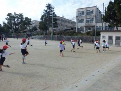 クラス遊びで,おにごっこをしました。範囲を決め,みんな元気に走りまわり楽しんでいました。