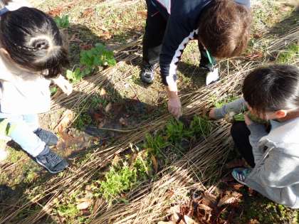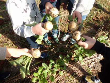 冬の間に育った野菜たちが収穫できました。収穫した「かぶ」と「水菜」はお家に持って帰りました。
