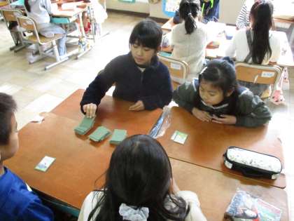年が明け,社会科の学習もかねて百人一首を体験しました。今回は坊主めくりをしました。「あ,この人の名前国語の教科書に出てきた!」「この人はたくさん歌を書いた人で有名な人だ!」などと絵札を見ながら楽しんで取り組むことができました。