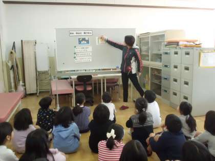 1月は,身長と体重を測りました。どの子も背が伸び大きくなっていました。くつしたの脱ぎ履きの練習を行った後に,「早寝・早起き・朝ごはん」の大切さの話もしてもらいました。これからも,早寝・早起き・朝ごはんをきちんと行い,体も心も大きくなっていきたいです。