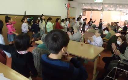 高齢者総合福祉施設まほろばへ町探検に行ってきました。施設内をいろいろと見て回り,高齢者の方がどのように生活されているのかを説明していただきました。見て回った後に,歌やダンスを発表しました。笑顔で喜んでくださっている姿から「行って良かった。」「喜んでもらえてうれしかった。」「やさしさをもらえた。」などの感想が出ました。