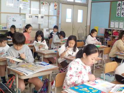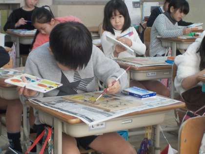 図画工作科では,「コリントゲーム」を作っています。デザインを考えて,台に色をぬっています。これからニスをぬって釘を打っていきます。できあがりがとても楽しみです。