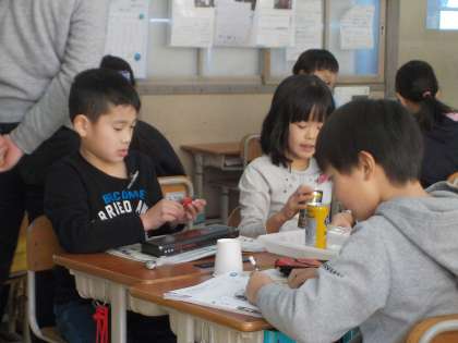 理科「じしゃくのふしぎをしらべよう」の学習で,じしゃくに引き付けられる物と引き付けられない物を調べる実験をしました。
