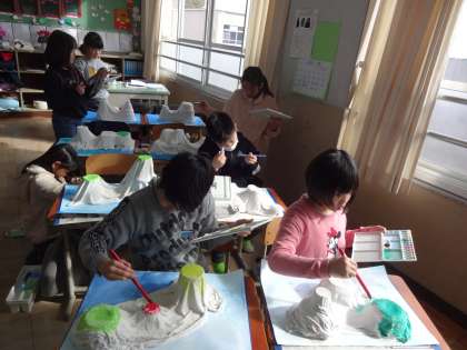 図画工作の時間が楽しみでしかたのない様子の子ども達。「私は,おかしの島にする。」「私は動物ワールド。」「私は,昔話の島。」などなど,創作意欲が高まっています。今日は島に色をつけました。「どんな色にしようかな。」「この色がいい!」自分で決めて,色をつけ,「おお!いいかんじ!」とニコニコ色をつけていました。