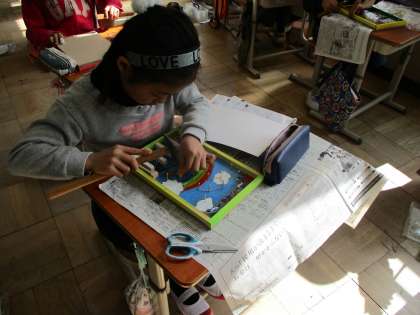 3年生は今作品展に向けて「コリントゲーム」の制作を頑張っています。ほとんどの子どもが初めてのこぎりを使って木を切りました。ドキドキの表情でしたがだんだんコツをつかんで最後は切れて満面の笑みを浮かべていました♪