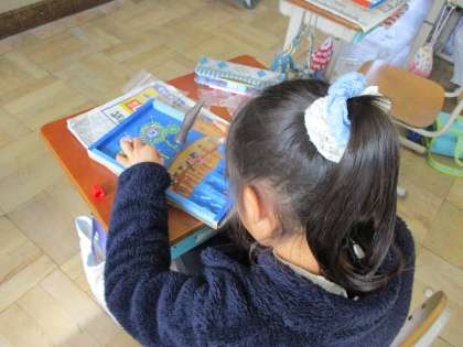 また,そのあとかなづちを使ってどのようにしたらビー玉が転がるかを工夫しながら,くぎを打っていきました。なかなか難しいですが子どもたちは大工さんになりきって頑張っています!クラス中にドンドントントンといい音が響き渡っています♪