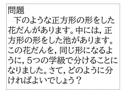 さて今回は,分ける問題ですよ。花だんの中に池があるのがポイントです。同じ形・同じ大きさで5つに分けてみよう。