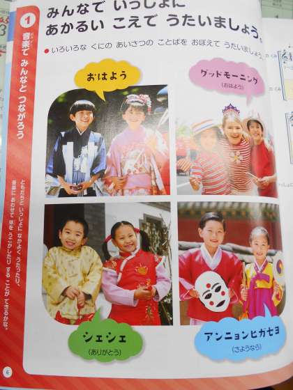 いろいろな くにの あいさつが 出てきて たのしいきょくです。