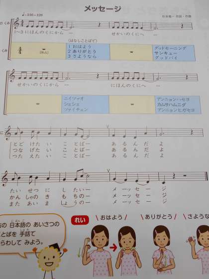 きょうかしょ 6・7ページに 「メッセージ」という うたが あります。