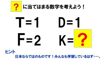 ちなみにこの問題,先生は答えを出すのに・・・5分以上かかりました・・・。頭が柔らかいあなたたちなら3分で答えられるかな?