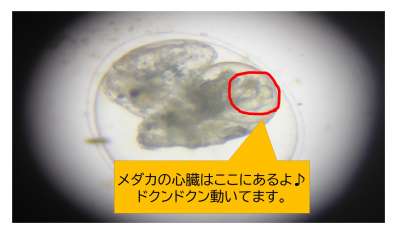 昨日はたまごの中をくるりと動いていましたが,今日はじっーとしたままです。メダカの心臓は,ドクンドクン動いています。写真の赤丸のところに 心臓がありますよ。