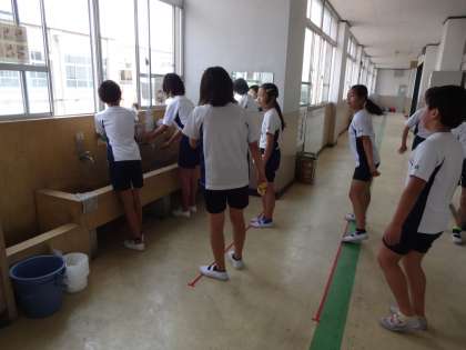 学校が再開し,以前と変わったことは,活動前,活動後に「手洗い」「うがい」を徹底していることです。そして,学習後にはすべての机を消毒しています。