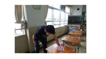 みんなが帰った後,先生たちはみんなが使う学習机やいす,トイレなどを 消毒しています。