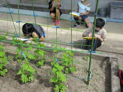 そのあとはポイントをおさえながらツルレイシの観察をしました。においも観察しようということでみんなでかがんでにおいを嗅ぎました。「先生〜,葉だけなのにゴーヤの青臭いにおいがする!」「ツルがグルグル支柱に巻き付いている〜!」「葉がギザギザしている!」「なんか葉がハートの形に似ている!」など気づきがたくさんの子どもたちでした。