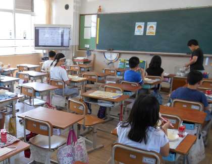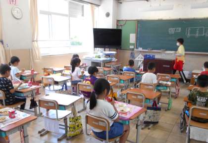今日から給食が始まりました。献立は,「むぎごはん」「ひらてんとこんにゃくのにつけ」「きりぼしだいこんのさんばいず」「ぎゅうにゅう」でした。とてもおいしくいただきました。明日も楽しみです。