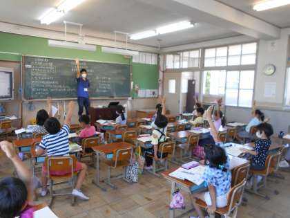 算数でも元気に手を挙げ発表してくれました。今日の学習は,かけ算のきまりを使って,九九よりも大きな数の表し方について考えました。ほとんどの子がすぐに答えが分かったようです。その後,なぜ,そういう答えになったのか訳を考え,発表していました。