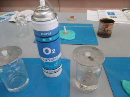 酸素を集めたびんのなかにろうそくの火を入れると,ほのおが大きくなって明るくなり,燃え続けることがわかりました。酸素には,ものを燃やすはたらきがあることがわかり,炭や線香を入れると線香花火のようにパチパチと燃えました。その様子を見た子ども達は,とても驚いた様子でした。
