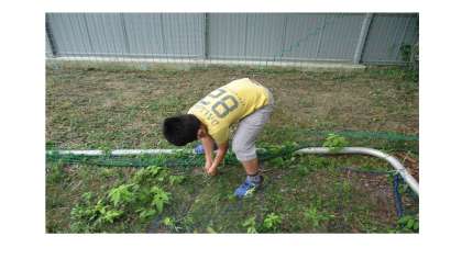 写真は,雑草の絵を描くために雑草を取っている様子です。「どの雑草にしようかな」,「なかなか抜けないぞ!」という姿がありました。教室に雑草を持ち帰り,魂を込めて墨で表しました。