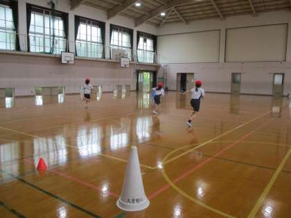 笛が鳴ってから走り出したり,ジャンプをしてから走り出し,誰が一番にゴールできるかを競い合いました。「やったー!1位だ!」,「負けないぞ!」と楽しく走る姿が見られました。