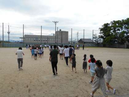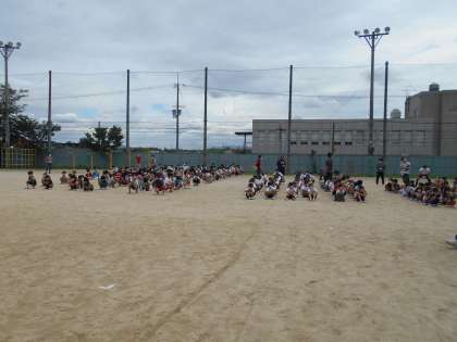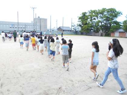 全校で避難訓練に取り組みました。命を守る大切な学習です。みんなハンカチで口や鼻を覆い,静かに運動場に避難できました。