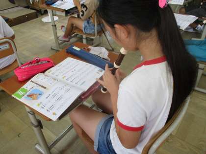 4年生はリコーダーの練習を頑張っています。4年生になって高いミの音に挑戦しています。今日は一人ずつリコーダーの音色を聴かせてもらいました。3年生の時に比べてタンギングがうまくなったり,指使いがスムーズになった子どもたち。家で一生懸命練習していることが伝わりました。
