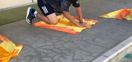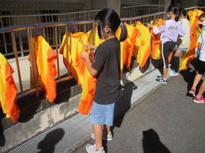 今日は天気が良かったので体育学習発表会で借りた法被をみんなで干し,きれいにたたみました。干すときはパン!パン!としっかりシワを伸ばしてからハンガーに干していました。たたむときも,貸してもらったので感謝の気持ちをこめて子どもたちは一枚一枚真剣にたたんでいました。次使う人もきれいな法被だと気持ちがいいもんね♪また,たたむのが終わった子どもからハンガーを回収し,ひもでまとめたり,みんながたたんだ法被を紙袋にきれいに入れたりと自分たちで何をしたらよいか考えて動く姿が素敵でした!どんなこともみんなでやれば早くできるし,楽しいね!